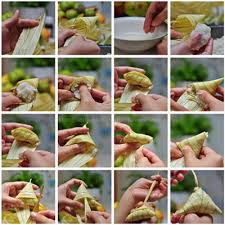 1. Beras dibasuh dan tos. Isi kelongsong ketupat dengan beras dalam sukatan suku daripada kelongsong.